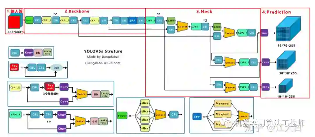 上图即Yolov5的网络结构图,可以看出,还是分为输入端、Backbone、Neck、Prediction四个部分。