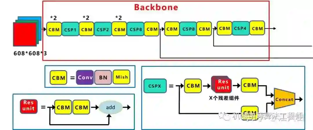 Backbone上采用了CSPDarknet53、Mish激活函数、Dropblock等方式,