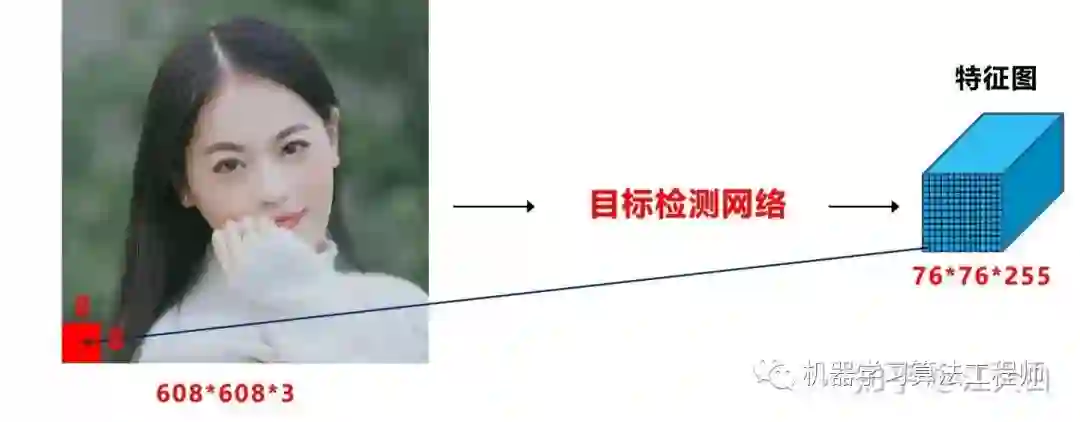 三个特征图中,最大的76*76负责检测小目标,而对应到608*608上,每格特征图的感受野是608/76=8*8大小。