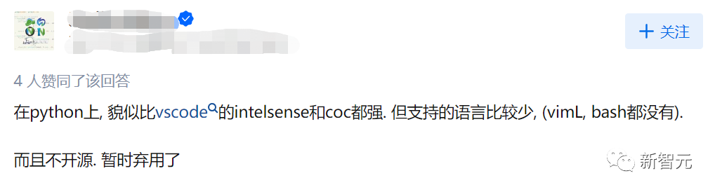 一位表示,「在python上,(Kite)貌似比vscode的intelsense和coc都强,但支持的语言比较少(vimL,bash都没有),而且不开源。暂时弃用了。」