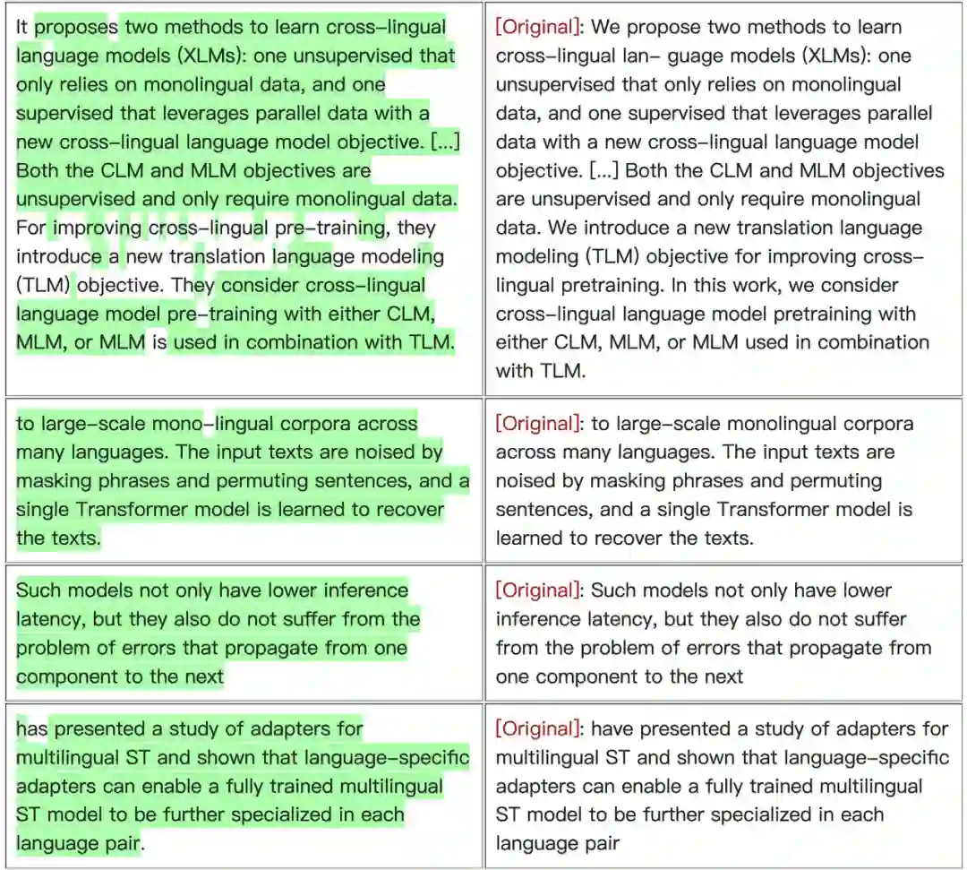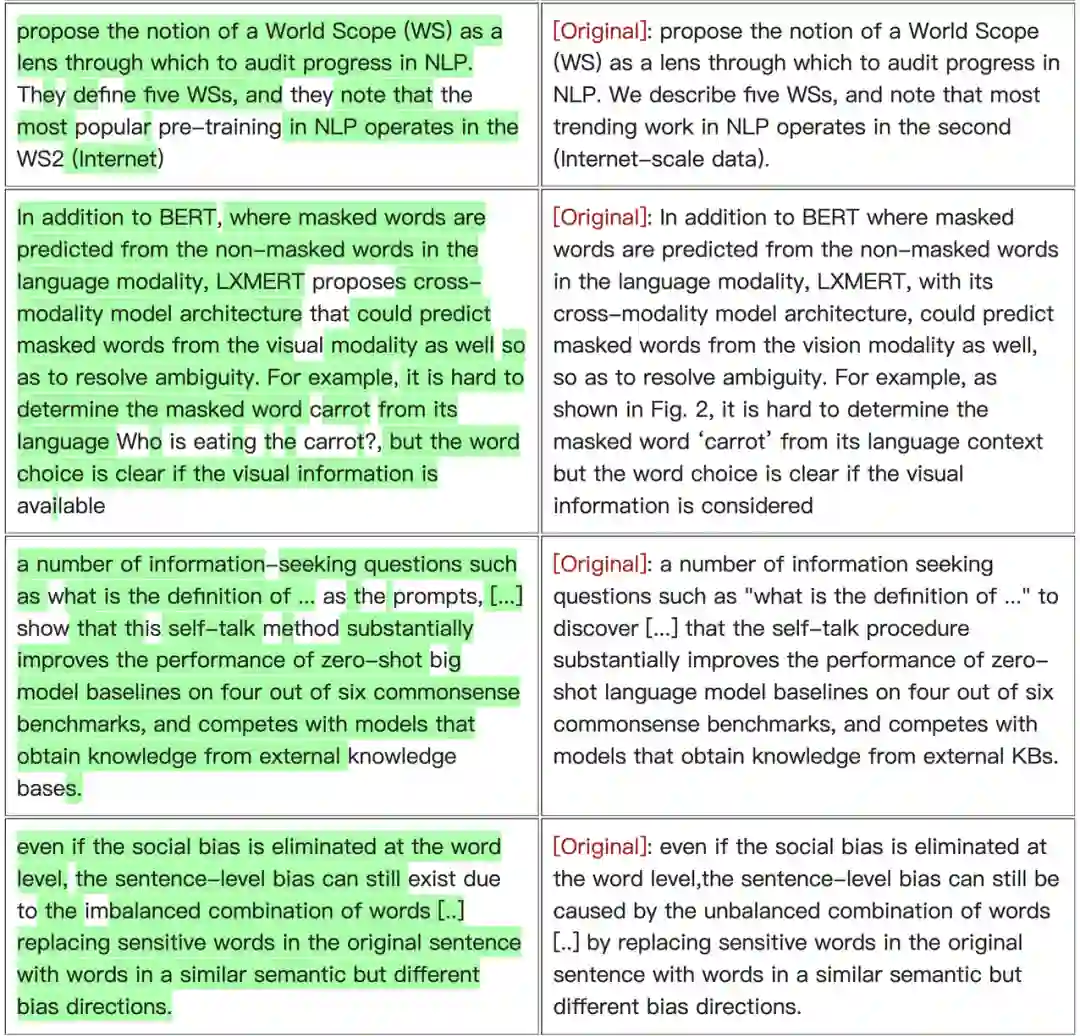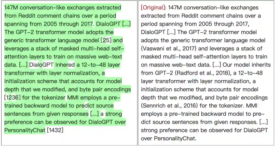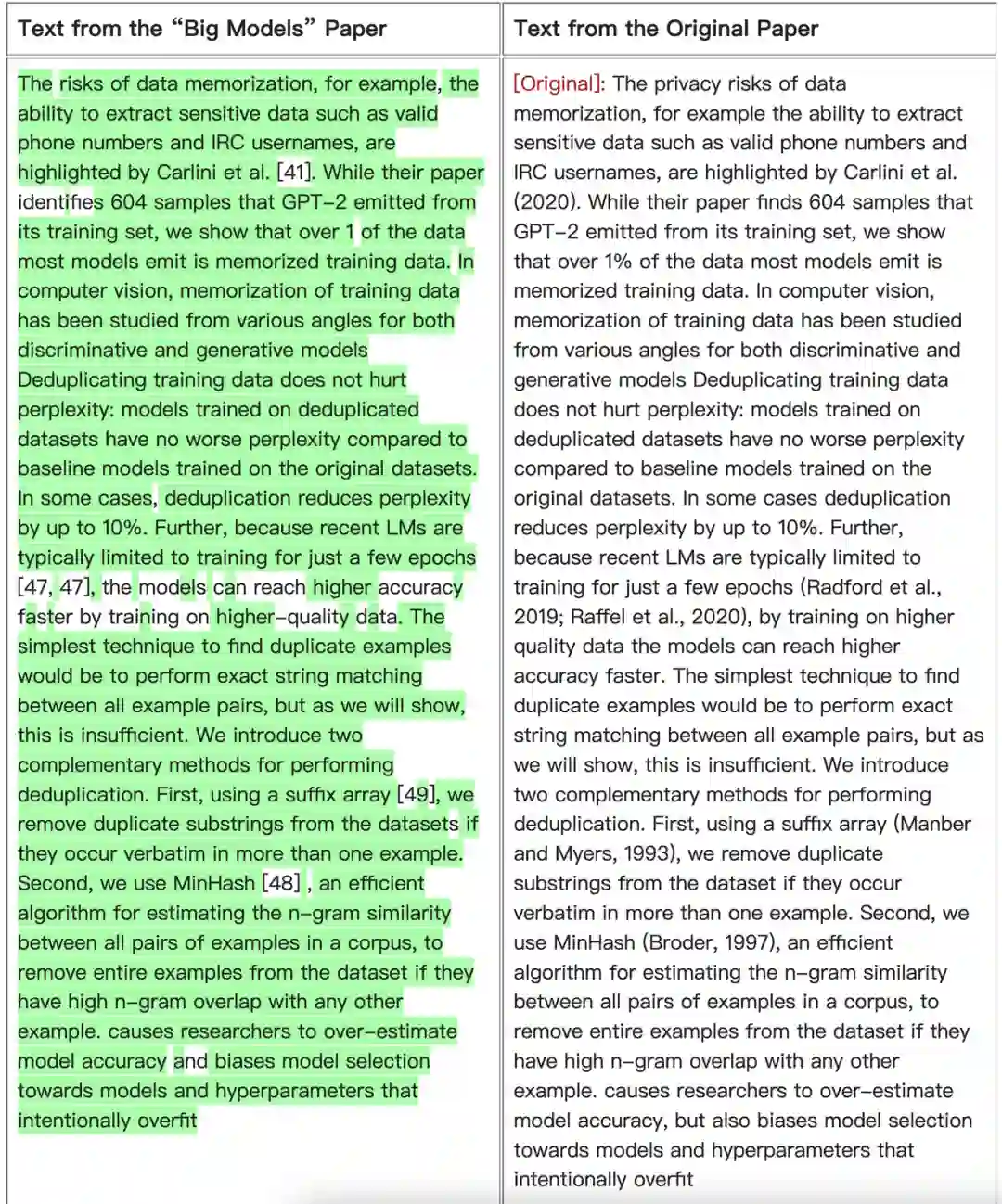 在博客中,声称被抄袭的作者也做出了举证:「Big Models」抄袭了 Carlini 论文的参考和相关工作部分。如下所示,左侧是「Big Models」论文中的文本,右侧是原始论文中的相应文本。被「复制」的文本以绿色高亮显示: