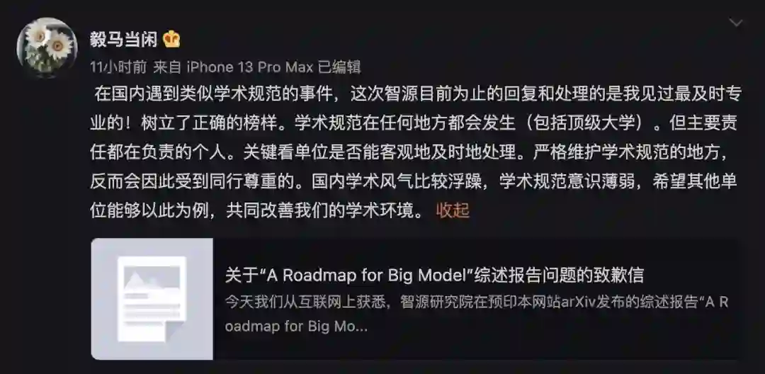 针对质疑,4 月 13 日,北京智源人工智能研究院发布了《关于 “A Roadmap for Big Model” 综述报告问题的致歉信》,并表示:「对这一情况,研究院立即组织内部调查,确认部分文章存在问题后,已启动邀请第三方专家开展独立审查,并进行相关追责。」