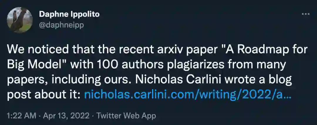宾夕法尼亚大学博士生、谷歌学生研究员 Daphne Ippolito 在推特上表示,智源研究院一篇拥有 100 位作者署名的综述研究《A Roadmap for Big Model》涉嫌抄袭了多篇论文内容,其中就包括自己团队的一项研究《Deduplicating Training Data Makes Language Models Better》,后者此前已被 ACL 2022 接收。