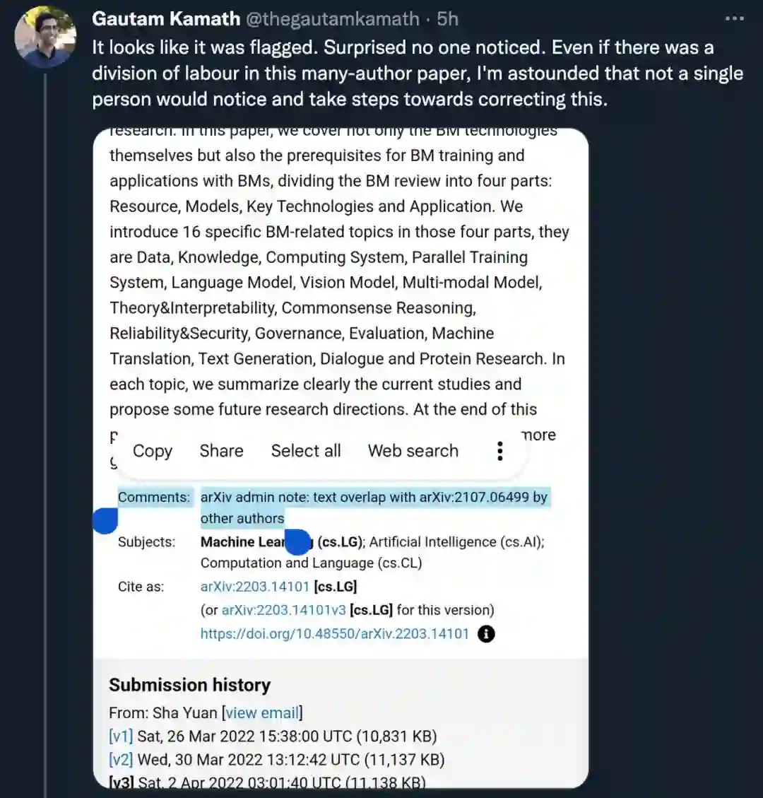 目前,在「Big Model」这篇论文的 arXiv 页面,管理员已经标注了两篇文章具有较高的文本重合度。