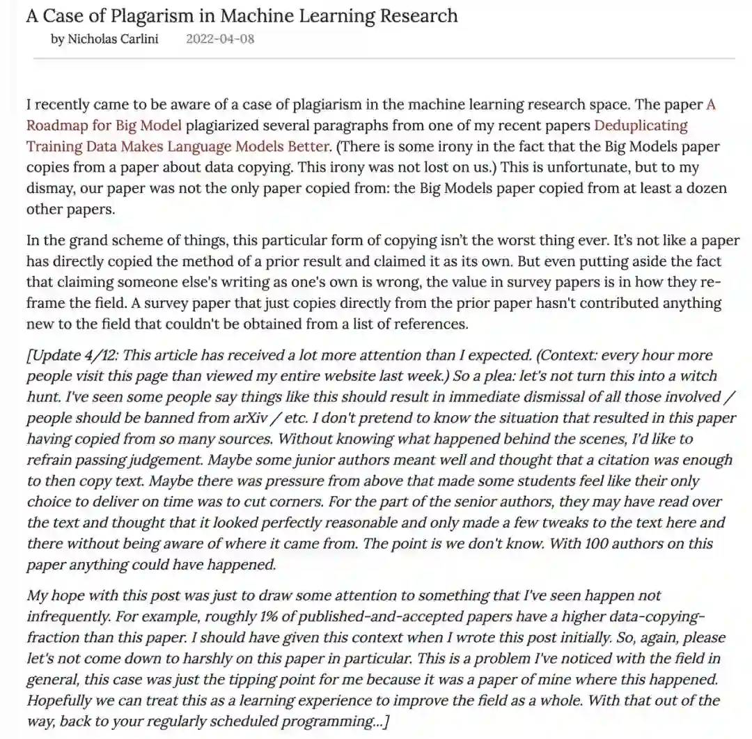 涉嫌被抄袭论文的作者之一 Nicholas Carlini 表示:「我的一位合著者正在阅读 Big Models 论文,并注意到其中一些文本似乎很熟悉,在快速查看后,我们发现实际上有一堆文本是直接从我们的论文中复制而来的。」