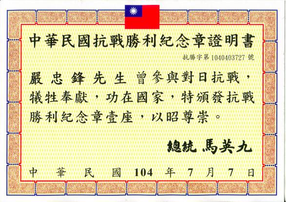 看着手中的抗战胜利70周年纪念章及台湾地区领导人马英九签名颁发的纪念章证明书,我感概万千。