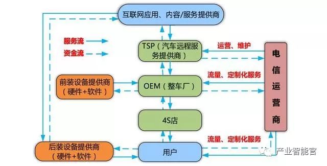在传统车联网产业链中,服务用户的不仅是车厂和4S店,还包括互联网应用提供商、软硬件提供商、汽车远程服务提供商以及电信运营商,如图3-3所示,其中直接服务于用户的有4S店、汽车后装设备提供商以及电信运营商,其他行业则是间接服务于用户。未来产业链将呈现各行业交错模式,资金的流动也呈现多向化、快速化的特点。