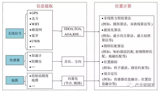 信息提取:可用于定位的对象包括无线信号(例如GPS、北斗、WiFi、蜂窝网等)、传感器(例如加速器、陀螺仪等)以及地图信息等,而不同的对象提取出的定位信息参数也各不相同。对于无线信号,收发机之间距离信息需要通过估计两者无线信道链路的参数信息来获取,该参数包括接收信号强度(Received Signal Strength,RSS)、到达时间(Time of Arrival,TOA)、到达时间差(Time Difference of Arrival,TDOA)、到达角(Angle of Arrival,AOA)等。实际接收的无线信号受非视距传输及多径效应、阴影效应的影响,因而即使精确估计信道参数信息,也难以获取准确的收发机之间的直线距离。传感器获得的是定位目标的运动方向、步长等信息。地图信息通常通过绘制高精地图,获得向量化参数,用来对定位目标进行约束或优化。上述参数是进行下一步位置估计的前提。