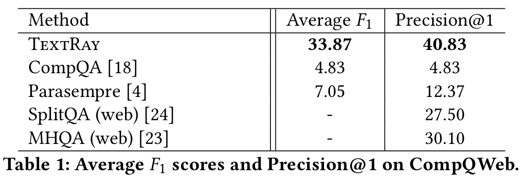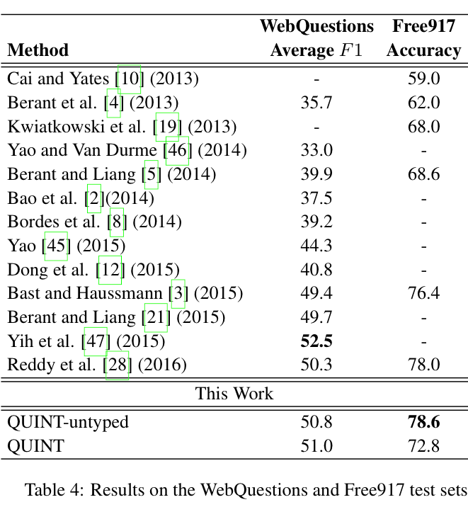 作者在 WebQuestions、Free917、ComplexQuestions 三个数据集上进行实验。在 WebQuesitions 上直接使用 F1 作为评价指标,没有达到 SOTA 效果。Free917 上的评价指标是正确回答的准确率,进行标准答案集进行评价。