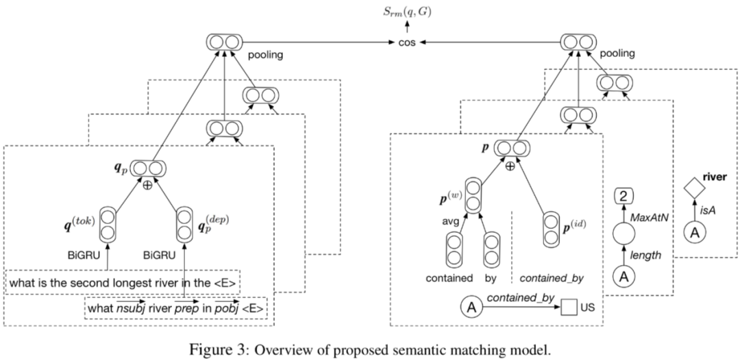问题的局部信息编码,是利用依赖解析表示答案和焦点结点之间长距离的依赖。问题中是没有直接的答案的,答案是用问题中的 wh-单词表示的,作者提取了从答案节点到问题中焦点结点的依赖路径。作者使用了另一个双向 GRU 层来产生依赖层次的向量表示,同时捕捉语法特征和局部的语义特征。
