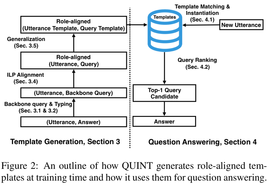 下图展示了学习和后续使用模板并利用知识库回答自然语言问题的过程。模板是在训练时生成的(下图左侧),在测试时被使用(下图右侧)。训练阶段的输入是问答对,即问答对是用于学习构建模板的。