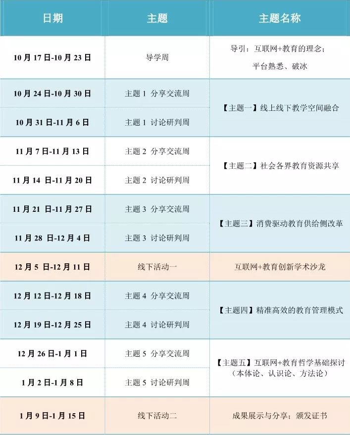 课程共13周,第一周为课程启动周,中间10周为分主题交流和研判。在课程中期和后期开展两次“互联网+教育”创新学术沙龙或论坛,方便参与者线下深入交流。