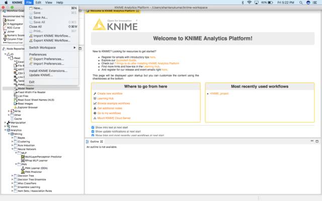 安装该平台,并为KNIME设置工作目录以存储其文件: