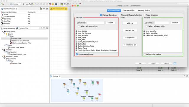 在节点存储库中找到节点列过滤器Column filter,并将其拖到工作流中。将预测器的输出连接到列筛选器,并配置它筛选所需的列。在这种情况下,你需要Item_Identifier、Outlet_Identifier和Outlet_Sales的预测。