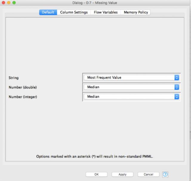 现在,当我们执行它时,在Missing value节点的输出端口上已经准备好了具有imputed values的完整数据集。在我的分析中,我选择了imputation 方法为: