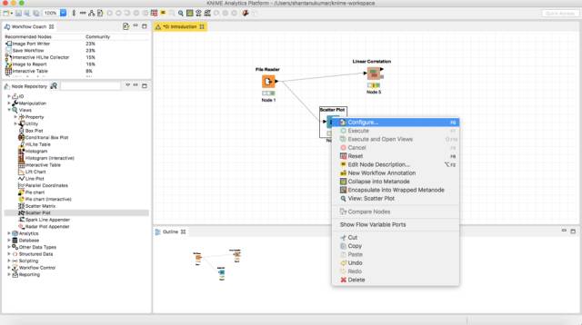 在我们的节点存储库中搜索Views 项下的Scatter Plot 。将其以类似的方式拖放到工作流中,并将文件阅读器的输出连接到此节点。