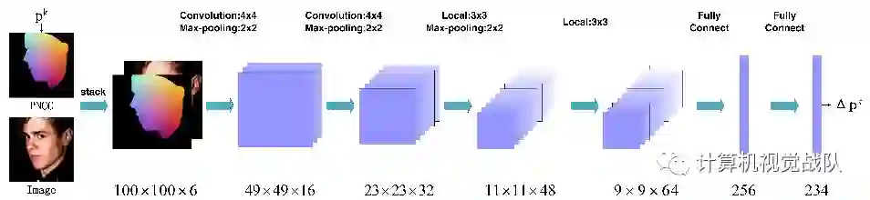 混合深度方法将CNN与3D视觉相结合,如投影模型和三维形变形状模型(上图)。它们不是直接预测二维面部关键点位置,而是预测三维形状可变形模型系数和头部姿态。然后,通过计算机视觉投影模型确定二维关键点位置。例如,(Zhu, X., Lei, Z., Liu, X., Shi, H., Li, S.: Face alignment across large poses: A 3d solution. In: IEEE Conference on Computer Vision and Pattern Recognition. Las Vegas, NV (2016))建立了一个密集的三维人脸模型。然后,采用迭代级联回归框架和深度CNN模型对三维人脸形状系数和姿态参数进行更新。在每一次迭代中,利用视觉投影模型将三维形状投影到二维,并将二维形状作为CNN回归预测模型的附加输入,以融合目前估计的三维参数。类似地,(Kanade, T., Cohn, J.F., Tian, Y.: Comprehensive database for facial expression analysis. In: IEEE International Conference on Automatic Face and Gesture Recognition, pp. 46–53)在第一个级联CNN模型中使用整个面部外观来预测三维形状参数和姿态的更新,而在后期级联CNN模型中使用局部斑块来细化关键点。