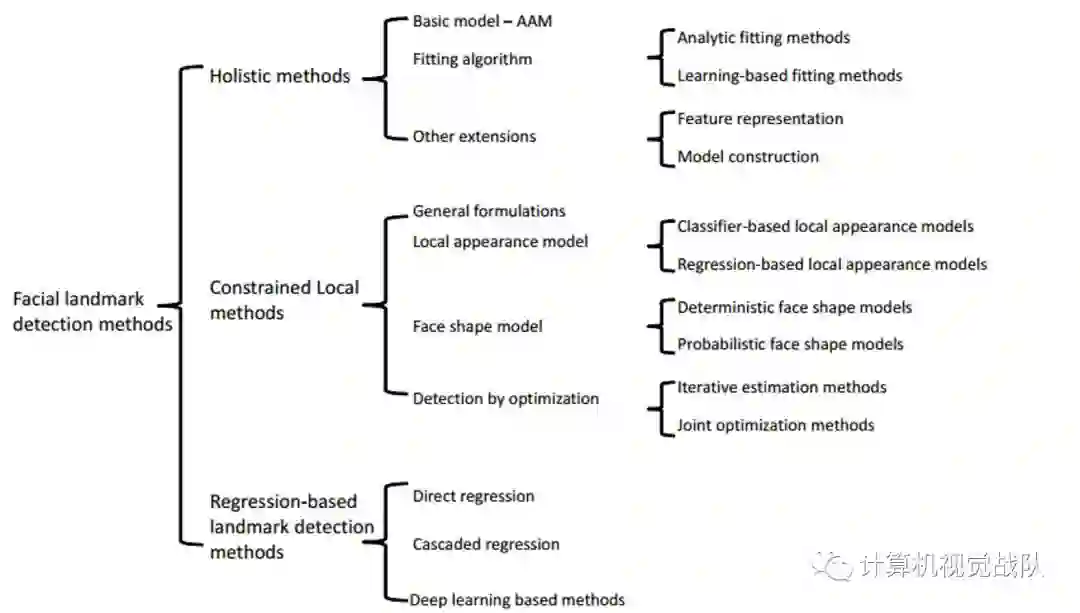 在之前讲解中,我们讨论了面部表情三种主要类别中的关键点检测方法:整体方法、约束局部方法(CLM)和基于回归的方法。三种主要的方法存在着相似之处和相互关系。