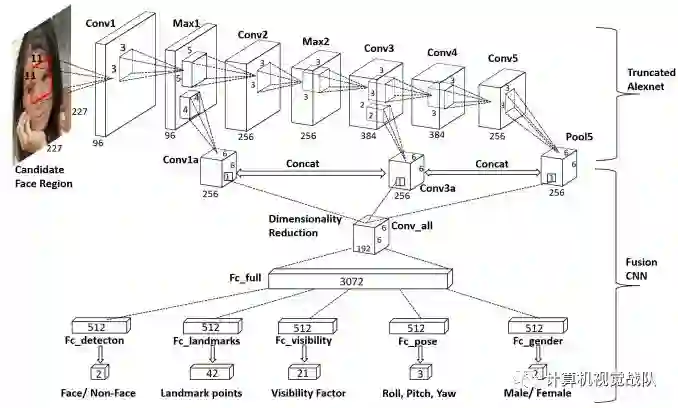 从那以后,在两个方向上都比早起某些工作有一些改进。在第一个方向上,(Zhang, Z., Luo, P., Loy, C., Tang, X.: Facial landmark detection by deep multi-task learning. In: European Conference on Computer Vision, Part II, pp. 94–108(2014)和Zhang, Z., Luo, P., Loy, C.C., Tang, X.: Learning deep representation for face alignment with auxiliary attributes. IEEE Transactions on Pattern Analysis and Machine Intelligence 38(5), 918–930 (2016))利用多任务学习的思想来提高性能。直觉是,多个任务可以共享相同的表示,它们的联合关系将提高单个任务的性能。例如,多任务学习与CNN模型相结合,共同预测面部特征、面部头部姿态、面部属性等。在该工作(Ranjan, R., Patel, V.M., Chellappa, R.: Hyperface: A deep multi-task learning framework for face detection, landmark localization, pose estimation, and gender recognition. CoRR abs/1603.01249 (2016). URL http://arxiv.org/abs/1603.01249)提出了一个类似的多任务CNN框架,以联合执行人脸检测、地标定位、姿态估计和性别识别。不同的是它结合了多个卷积层的特征,以利用粗特征表示和精细特征表示。