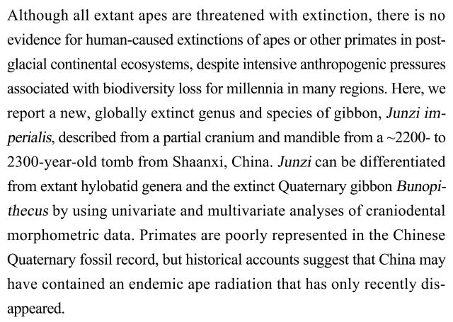(导读:向菲菲)目前尚无任何证据表明冰河期后大陆灵长类灭绝与人类有关。本研究报道了一种已灭绝的全新长臂猿属,帝王君子长臂猿,其头颅和下颌骨发现于陕西一座2200-2300年前的古墓。虽然中国第四纪灵长类动物化石记录稀少,但历史记录表明中国可能存在地方性的猿类辐射并于近期才消失。