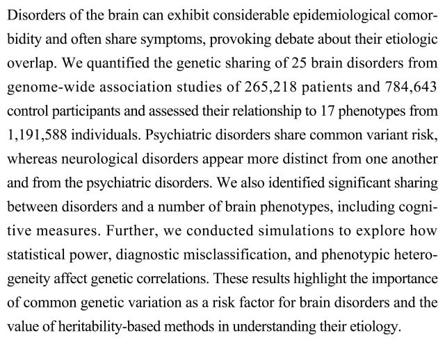 (导读 郭怿暄)脑部疾病常表现出共患病并具有相同症状,这使其在病因学上是否重叠存在争议。本研究对25种脑部疾病患者的遗传共性进行定量分析并寻找其与表型的关系,发现精神性疾病之间有共同遗传变异,但神经性疾病彼此间以及与精神性疾病间均存在明显差异。提示脑部疾病存在共同的遗传变异作为危险因素,该研究为基于遗传力理解病因学的方法奠定基础。