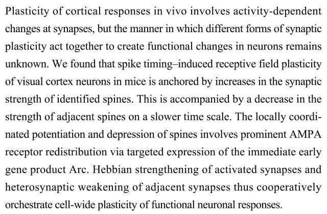 (导读 董堃)在体皮层可塑性涉及突触层面的活性改变,然而突触是如何相互作用导致神经元功能变化的还尚未可知。本研究发现小鼠视觉皮层神经元动作电位发放时间诱导的感受野可塑性是由棘突突触强度增加所锚定的。突触激活的赫布增强和相邻突触的异种弱化成功协调了细胞水平功能神经元反应的可塑性。