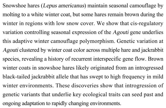(导读 王思菲)雪鞋兔(Lepus americanus)多为白毛冬毛做伪装,但一些少积雪区的个体冬毛为褐色。我们发现控制季节性表达Agouti基因的顺式调控变异是这种适应性冬季伪装多态性的基础,褐色冬毛可能源于黑尾长耳野兔等位基因的滲入,并在少积雪环境中迅速扩散。结果表明,关键生态性状的遗传变异渗入让物种具有适应环境迅速变化的可能。