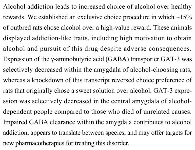 (导读 郭怿暄)为何部分人在酒精和健康奖励中会选择前者并出现酒精成瘾的机制尚不清楚。本研究建立大鼠酒精选择模型,发现在表现出酒精成瘾症状的大鼠杏仁核中GABA转运蛋白GAT-3表达选择性下降,酒精依赖人群杏仁核中该蛋白表达同样下降,这表明杏仁核中GABA清除受损可能造成酒精成瘾,这一机制在物种间保守,可望为寻找全新药物靶点奠定基础。