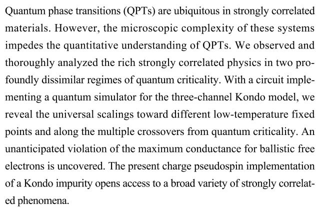 (导读 胡琦琳)强相关材料的微观复杂性阻碍了对量子相变定量的认识。本研究利用三通道Kondo模型实现量子模拟器的电路,揭示了对应不同低温固定点和量子临界点的多个交叉点的通用标度,并意外发现最大电导违反了弹道输运自由电子模型。Kondo杂质的电荷赝自旋的实现有助于发现其他的强相关现象。