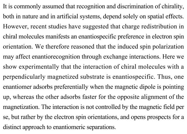 (导读:向菲菲)识别和区分天然或人造手性物质通常被认为只依赖于空间效应。本研究在实验上发现手性分子与垂直磁化衬底的相互作用会产生对映关系,及一对映体在磁偶极子向上时优先吸附,而另一对映体则在磁化方向相反时吸附更快。这种作用不是由磁场本身控制,而是由电子自旋的方向。研究结果开辟出一种独特的分离对映异构体的途径。
