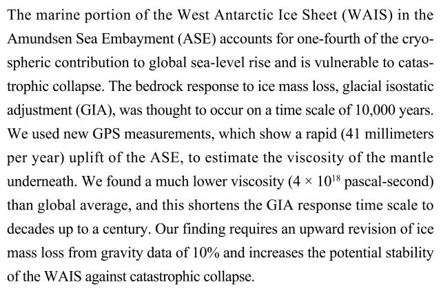 (导读:阿金)阿蒙森海域(ASE)南极西部冰盖(WAIS)的海洋部分对全球海平面上升贡献近1/4影响。本研究使用GPS测量技术估计其下地幔粘度,显示ASE以每年41mm速度向上抬升,发现粘度低于全球平均值,并大幅缩短冰川均衡调整(GIA)时间。结果增加了WAIS对应灾难性崩塌的潜在稳定性。