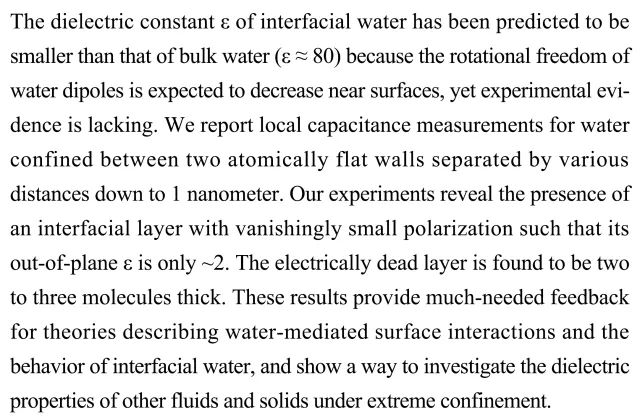 (导读:向菲菲)界面水由于其偶极子的旋转自由度在界面降低,造成其介电常数小于正常非空间受限的水,但这一理论预测一直缺乏实验证据。本研究通过测量被两个具有原子级厚度的腔壁限制的水的局部电容,发现了具有微小极化的界面层的存在,其介电常数只有~2。该结果为研究其他固、液体在极端空间限域条件下的介电性质提供了一种可行方法。