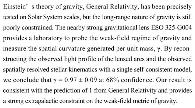 (导读 胡琦琳)爱因斯坦的广义相对论已经在太阳系的尺度内被精确的测试,但引力的长程性质仍存在争议。本研究利用强引力透镜ESO 325-G004探测弱场的引力状态,以及测量了单位质量产生的空间曲率γ。通过分析透镜光剖面和空间分辨的恒星动力学,研究人员得出的空间曲率γ与广义相对论预测的一致,为弱场下引力度量提供了银河系外的强约束。