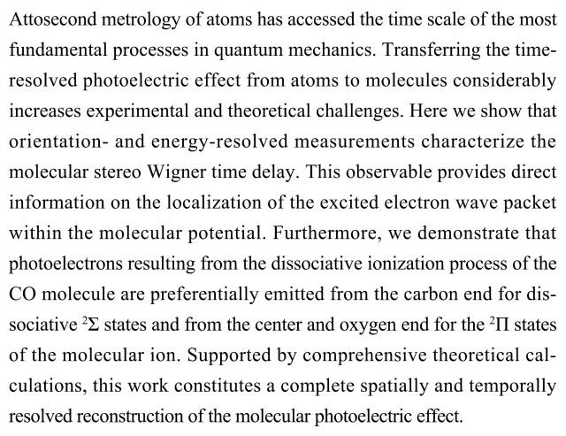 (导读:阿金)原子的阿秒级计量已涉及到量子力学中最基本过程的时间尺度。从原子到分子的时间分辨光电效应无疑增加了实验和理论难度。本研究展示空间分辨和能量分辨测量能够描述分子立体韦格纳时间的延迟特征。这种可观测的现象提供了关于分子内被激发的电子波包的局域化信息。研究结果实现了分子光电效应的空间和时间分辨完整重构。