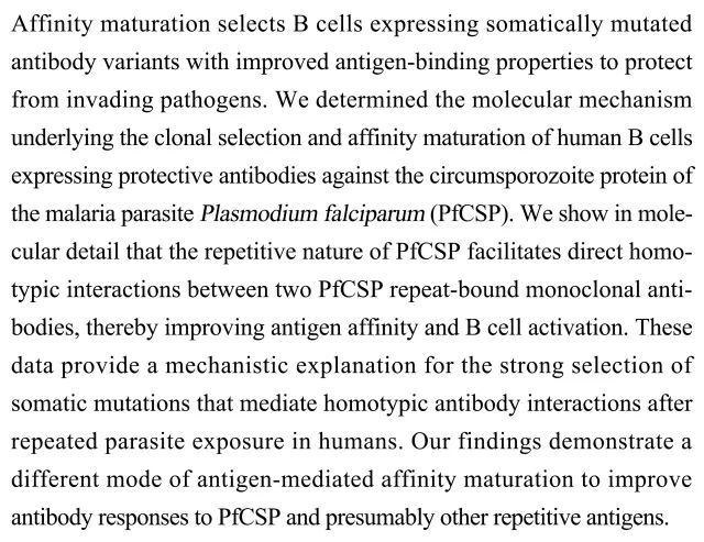 (导读 王思菲)为了抵抗病原体入侵,亲和力成熟会选择表达抗原结合能力更强的变异抗体的B细胞。本研究确立了表达恶性疟原虫环子孢子蛋白(PfCSP)保护性抗体的人类B细胞克隆选择和亲和力成熟的分子机制。发现PfCSP的重复序列加强了与之结合的两个单克隆抗体直接同型相互作用,进而增强抗原亲和力和B细胞活化。该研究发现了介导的亲和力成熟的全新模式。
