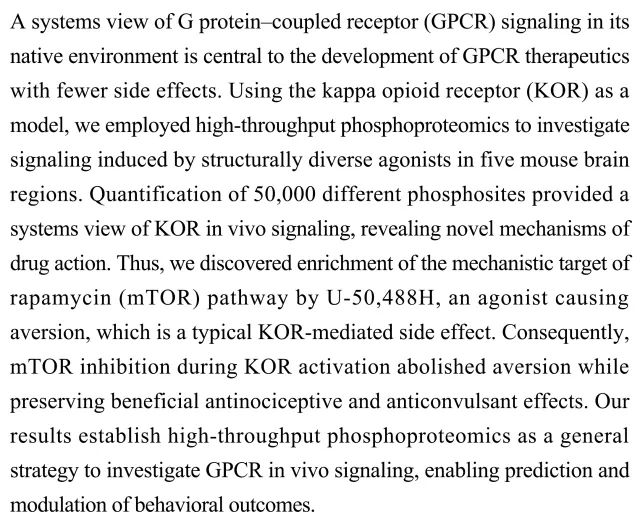 (导读:过泽远)对G-蛋白联结受体(GPCR)信号在自然环境中的系统性观察对开发副作用更小的GPCR治疗方法很重要。本研究以κ阿片受体(KOR)为模型,在结构多样的激动剂诱导后对小鼠大脑五个区域的磷酸化蛋白质组进行高通量分析,对50000个磷酸位点进行定量,揭示药物作用的全新机制。发现并纠正了U-50,488H治疗中mTOR激活引起的副作用,这一发现为在体研究GPCR信号带来普适方法。
