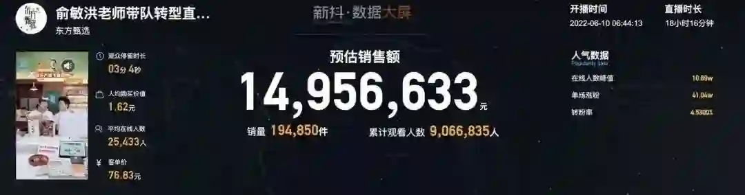 6月10日晚,新东方董事长俞敏洪空降,更是让当时直播间同时达到10.89万人在线观看的新高,单场涨粉就达到41万,现有总粉丝数215万,并还在持续增长中。