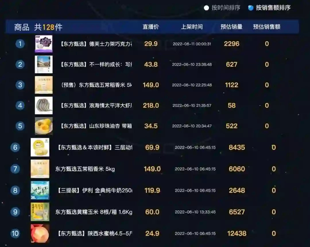 (图:「东方甄选」直播间6月10日商品销售额排行及相关账号)
