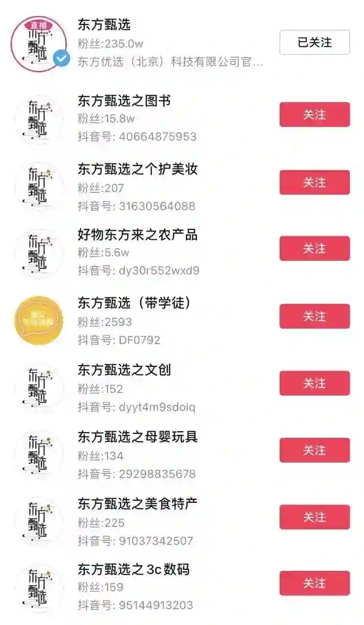「东方甄选」并不满足于农产品带货,正在将选品品类拓展至更多消费品。从直播间的商品栏可看出,除食品饮料外,带货商品还涵盖了美妆护肤、家用电器、家居生活、图书文娱等品类。但销售额最好的十件商品中,仍是以农产品为主。在抖音搜索「东方甄选」,相关垂直账号也涵盖了图书、个护美妆、文创、母婴等领域。