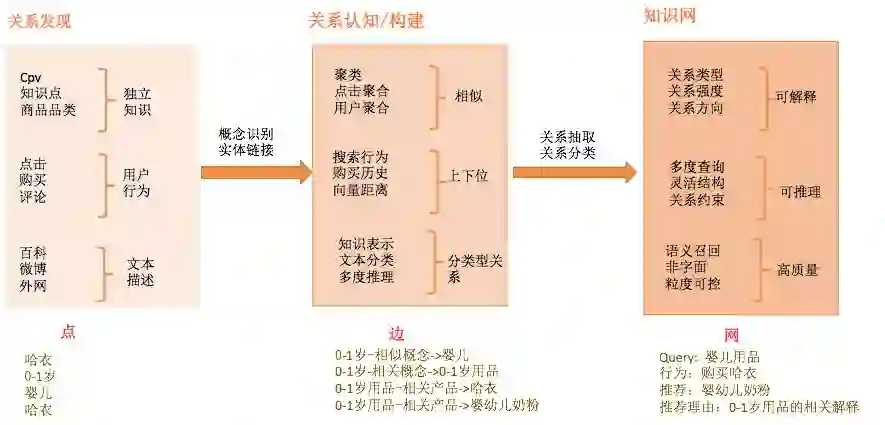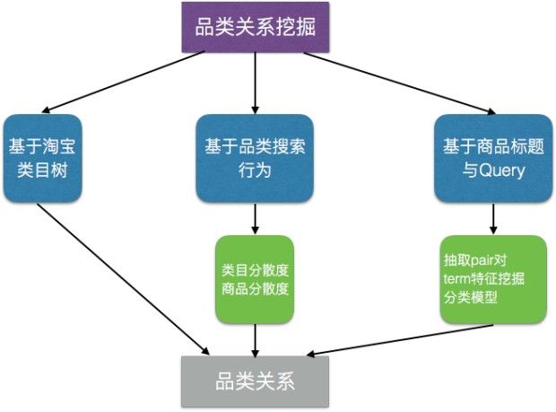 挖掘了概念相当于我们得到了图上的节点,在概念挖掘之上,我们又着手建立概念与类目和品类,概念和概念之间的关系,相当于建立了图上的有向边,并计算边的强度,具体流程如下: