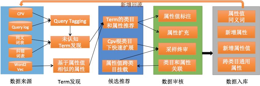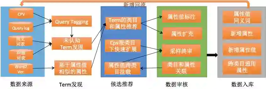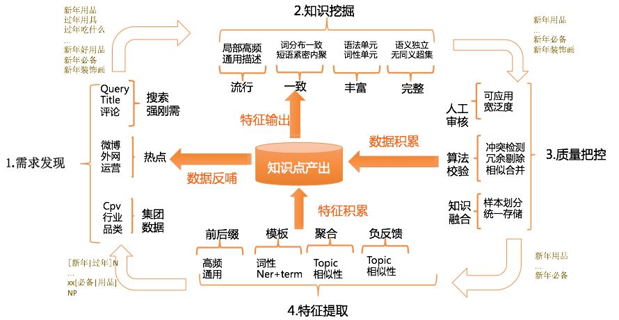 短语挖掘:商品图谱端我们需要的是做更多的商品属性认知,我们知道,完善的cpv体系的前提是phrase的认知,针对此我们建立了一个bootstrap框架下的cpv挖掘闭环,目标是能够长期有效积累cpv数据,扩大query和商品的认知(这也是商品打标的数据来源之一)。