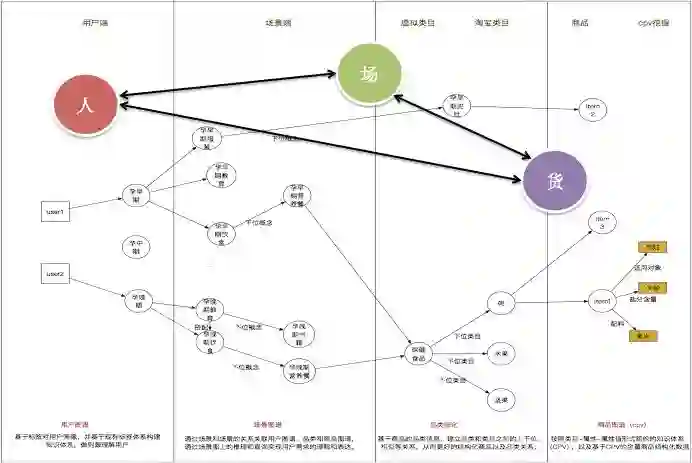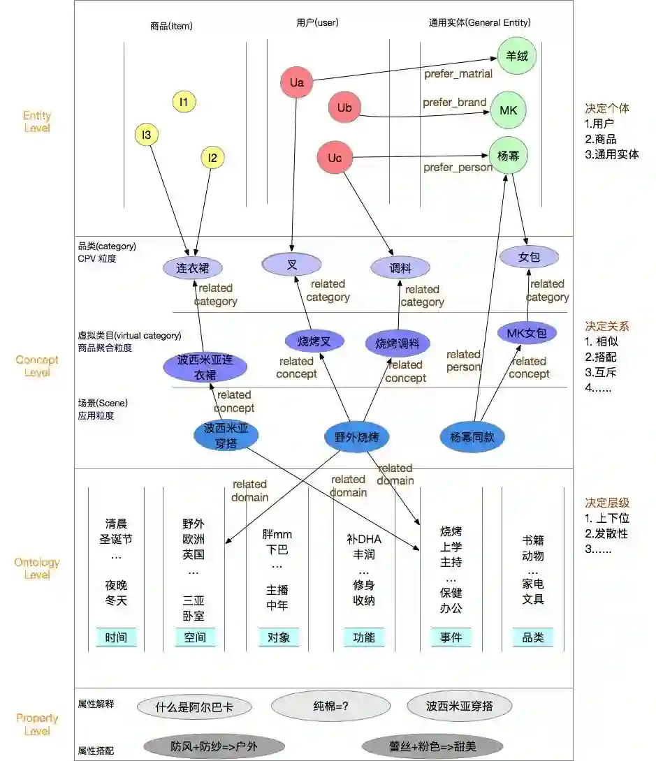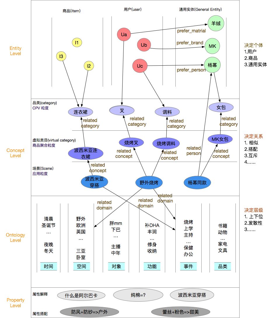 从数据层面上来看,我们要描述一个事物(entity),首先需要把它定义为一种类别(instance-of-class)的实例,这种类别通常又可以通过一个概念(concept)来表示,不同的概念会有自己不同的属性(proeprty),一类概念的具有的属性集合可以称为概念的schema,有同一类schema的概念一般会属于不同的领域(domain),领域内有自己的语义本体(ontoloty),通过本体的层次(比如“英国"-is-part-of-”英国"),我们可以形式化概念的层级和表示。 那么由细到粗的,我们定义了一套电商概念体系的表示方法,通过不断细化ontology和concept,以及他们之间的关系,来关联起用户和商品,甚至外部的实体。