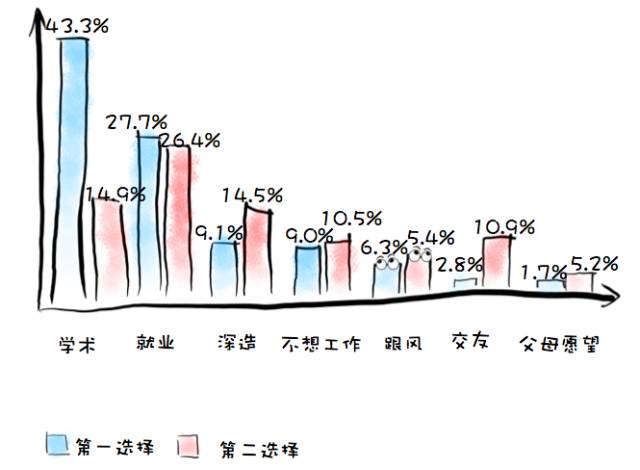 有43.3%的人第一选择是因为对科学和学术研究感兴趣而选择读研,共有58.2%的学生将“兴趣”视作主要因素。