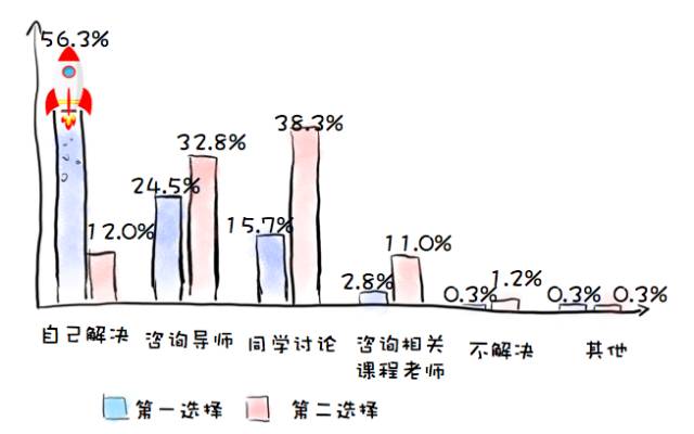 在学习和科研上遇到困难了, 有56.3%的童鞋首选是自己解决!第二选择才是咨询导师或与同学讨论。清华同学不愧是独立自主、自强不息。