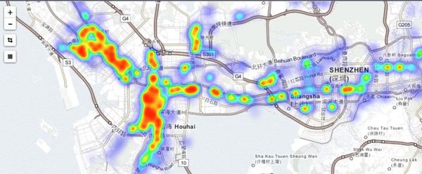 还共享了一些和屌丝青年生活最相关的分析及数据。下图是深圳市早晨高峰时段某类人群出行的热点图,通过热点分析,试图找出这类人群的居住和上班的聚集区。