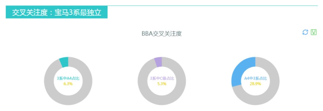 下图是抓取汽车之家的数据,做出 BBA(奔驰宝马奥迪)这三大豪华品牌的交叉关注度,帮助品牌及 4A 公司了解他们用户的忠诚度以及品牌之间迁移的难度。