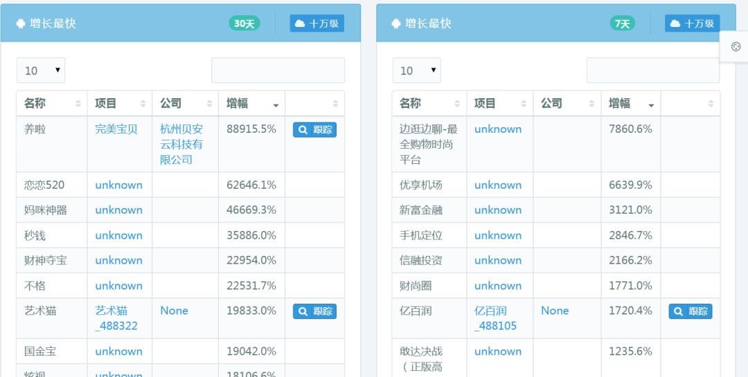 最初的产品纯粹是为基金服务。下图是在各个维度找出最有价值的 App,各种量级范围内在 30 天 /7 天增长最快及评价最好榜单。(顺便吹一下牛,我们这个榜单很早就发现小红书 App 的快速增长趋势以及在年轻人中的极佳口碑)