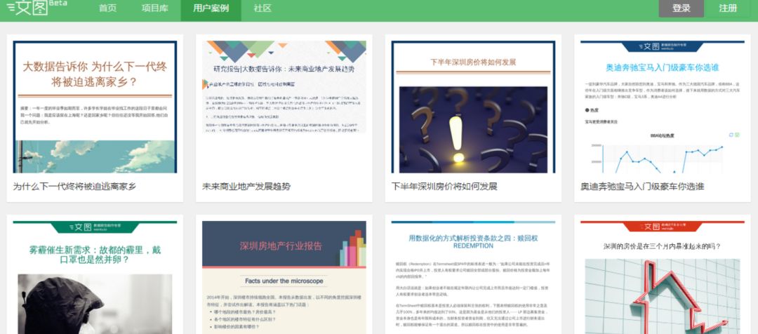 第二款:数据可视化我们在工作中也深刻觉得以前制作图表和展示数据的方式太 low、太繁琐,我们希望去改变这个现状,于是开发了一套基于 Web 来制作图表的工具文图。远有 Excel/Powerpoint 对标,近有 Tableau 对标。下图是文图丰富的案例库及模板库。