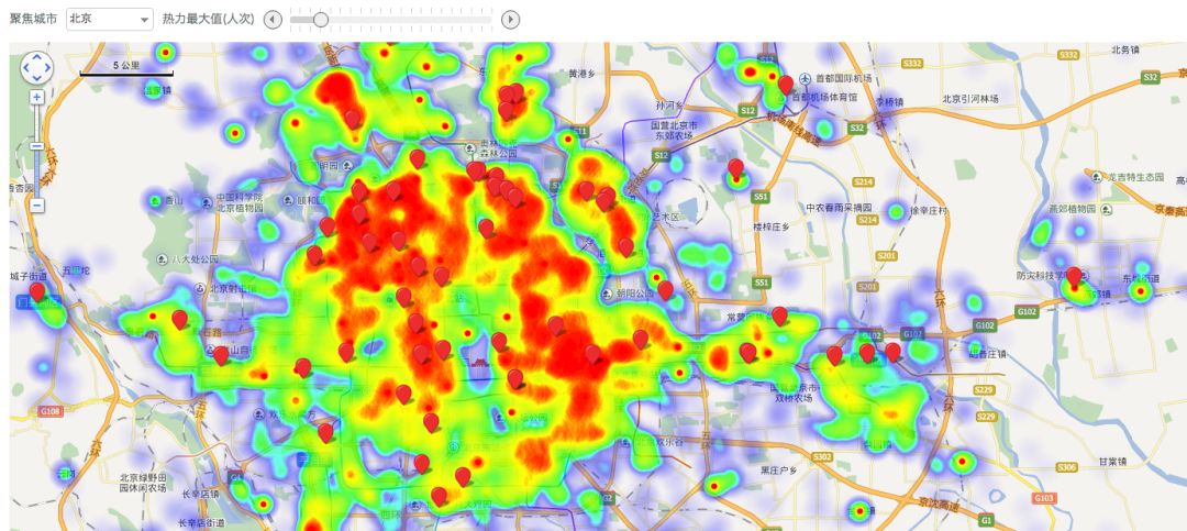 降低与高大上基金的合作强度,转而与更接地气的各类品牌合作,让我们团队更贴近客户、更贴近真实需求。于是基于这些需求,我们开始尝试将之前在数据方面的积累给产品化,特别是能做出一些平台级的产品,于是我们开发出两款产品:第一款:选址应用选址是现在许多公司头疼的难题,以前完全是拍脑袋。因此我们开发出这样一套工具,帮助公司能够更理性更多维度得选址。下图,我们抓取多个数据源并完成拼接,根据用户的快递地址,勾画出某时尚品牌用户的住址,帮助其选址在北京开门店。