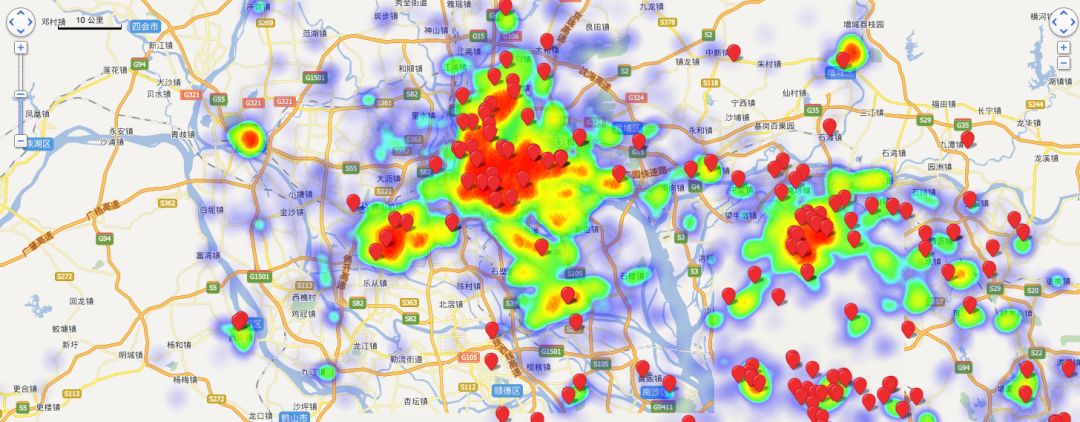 下图,我们抓取多个数据源并完成拼接,根据大型超市及便利店与某类型餐馆在广州地区的重合情况,帮助某饮料品牌选定最应该进入的零售店面。